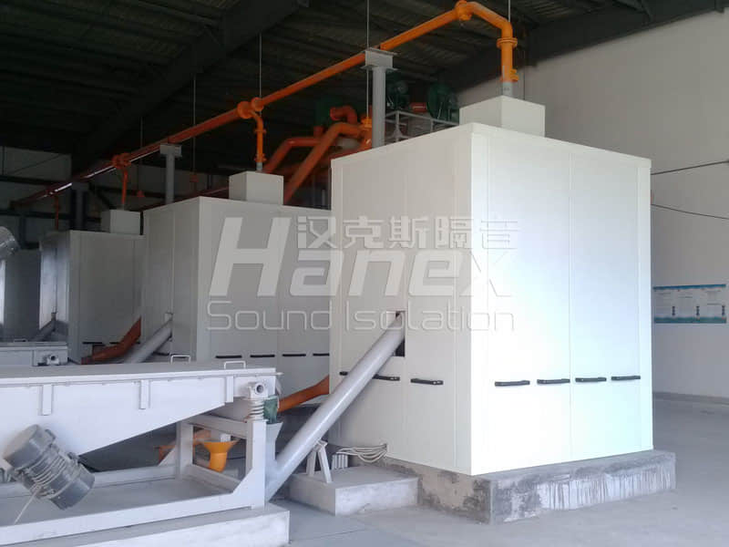 案例簡介:廠區(qū)車間內(nèi)4臺破碎機運行時噪聲量達(dá)到120分貝,影響廠區(qū)環(huán)境和工人工作。漢克斯對每臺破碎機單獨設(shè)置隔聲罩后,距離設(shè)備一米處測得噪聲值為80分貝,低于國家衛(wèi)生標(biāo)準(zhǔn),符合降噪要求。隔聲罩內(nèi)具有通風(fēng)散熱照明功能,能夠保證內(nèi)部設(shè)備的正常運行。