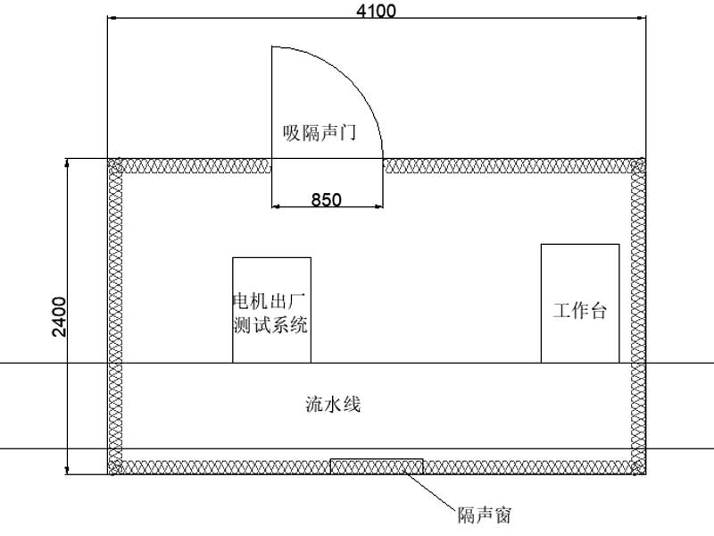1.1.1根據(jù)我司技術(shù)人員現(xiàn)場測量,流水線處環(huán)境噪聲為75-78dB(A),設(shè)計(jì)隔音房尺寸為:2400mm*4100mm*2400mm。隔音房板厚120mm,預(yù)計(jì)隔音房安裝完成后,內(nèi)部噪聲值降至40dB(A)。